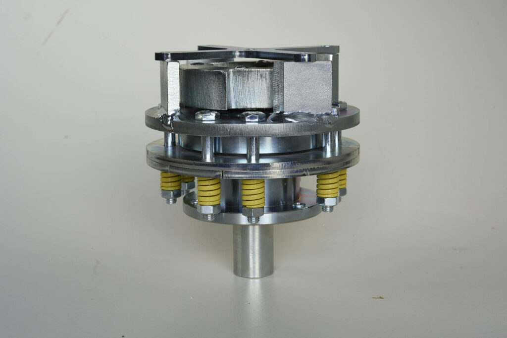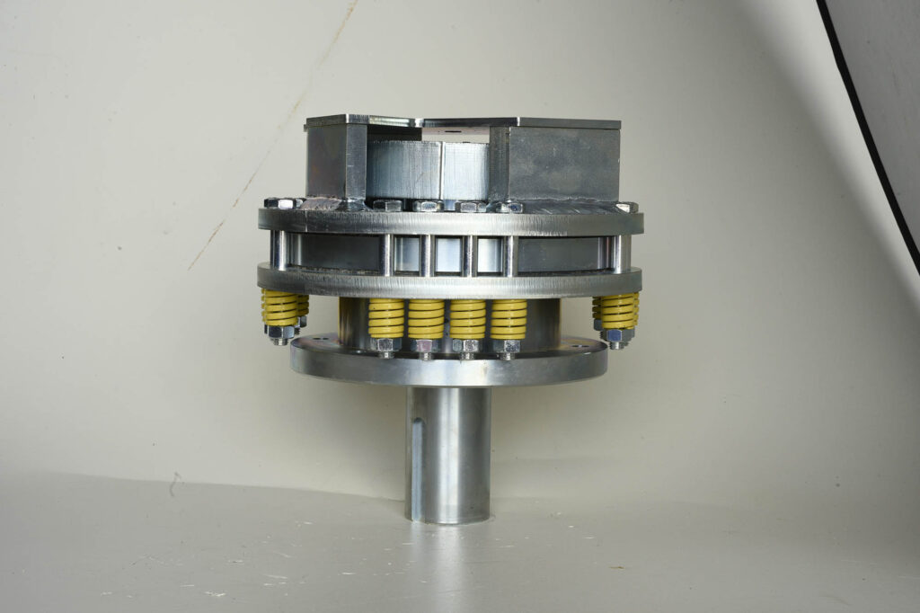 Il dispositivo paracadute ha funzione di arrestare in modo progressivo la caduta verticale di un sistema di sollevamento azionato da meccanismo pignone-cremagliera, o pignone-catena. L’albero di trasmissione, azionato direttamente dal pignone impartente il moto, porta con sé due masse centrifughe che al superamento della velocità nominale innestano il meccanismo. Il paracadute innestato genera una coppia frenante tale da arrestare progressivamente il movimento di discesa della struttura a cui è vincolato.