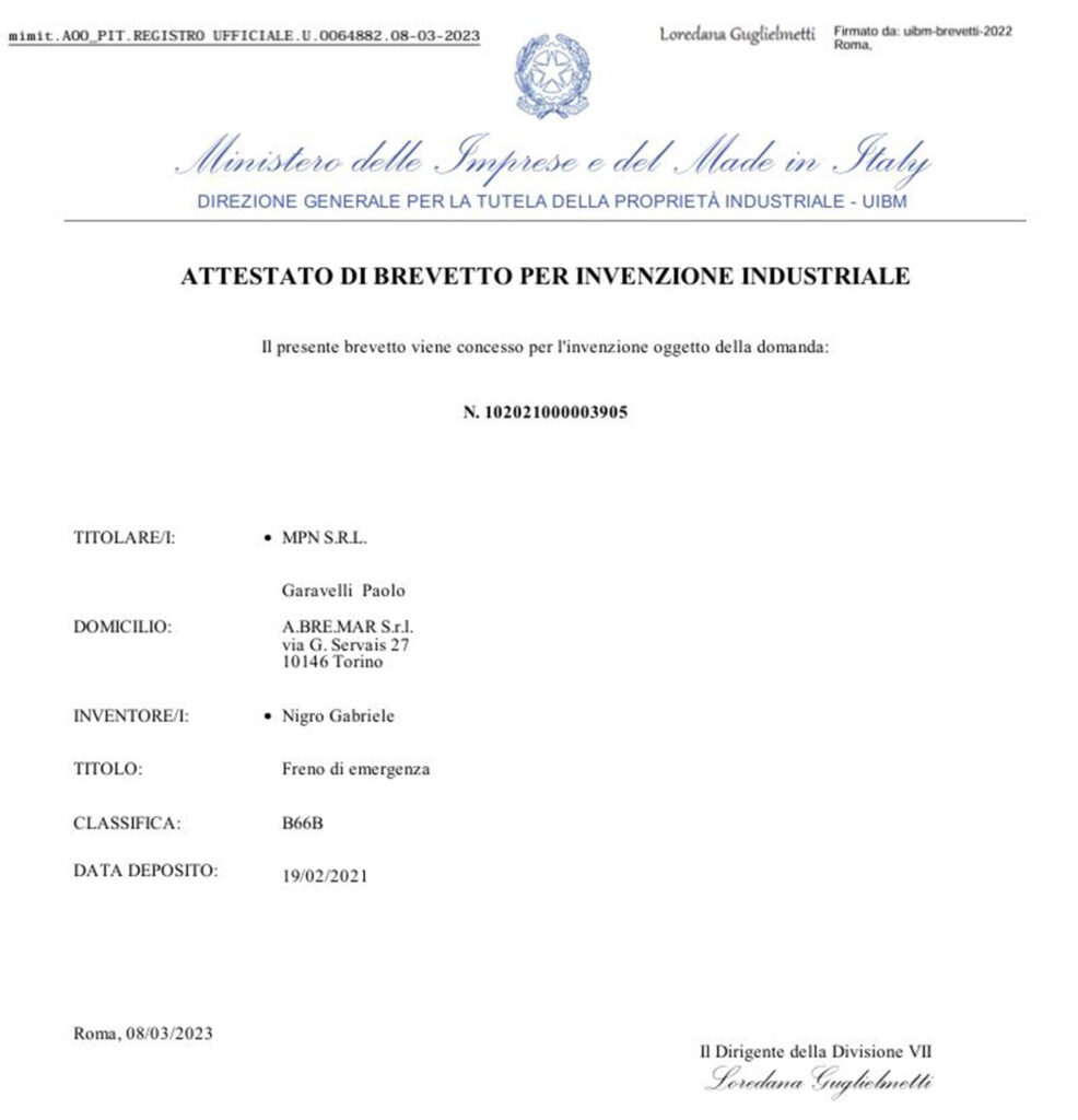 FRENO D’EMERGENZA PER ATTREZZATURE MOSSE DA CINEMATISMO PIGNONE-CREMAGLIERA O PIGNONE-CATENA