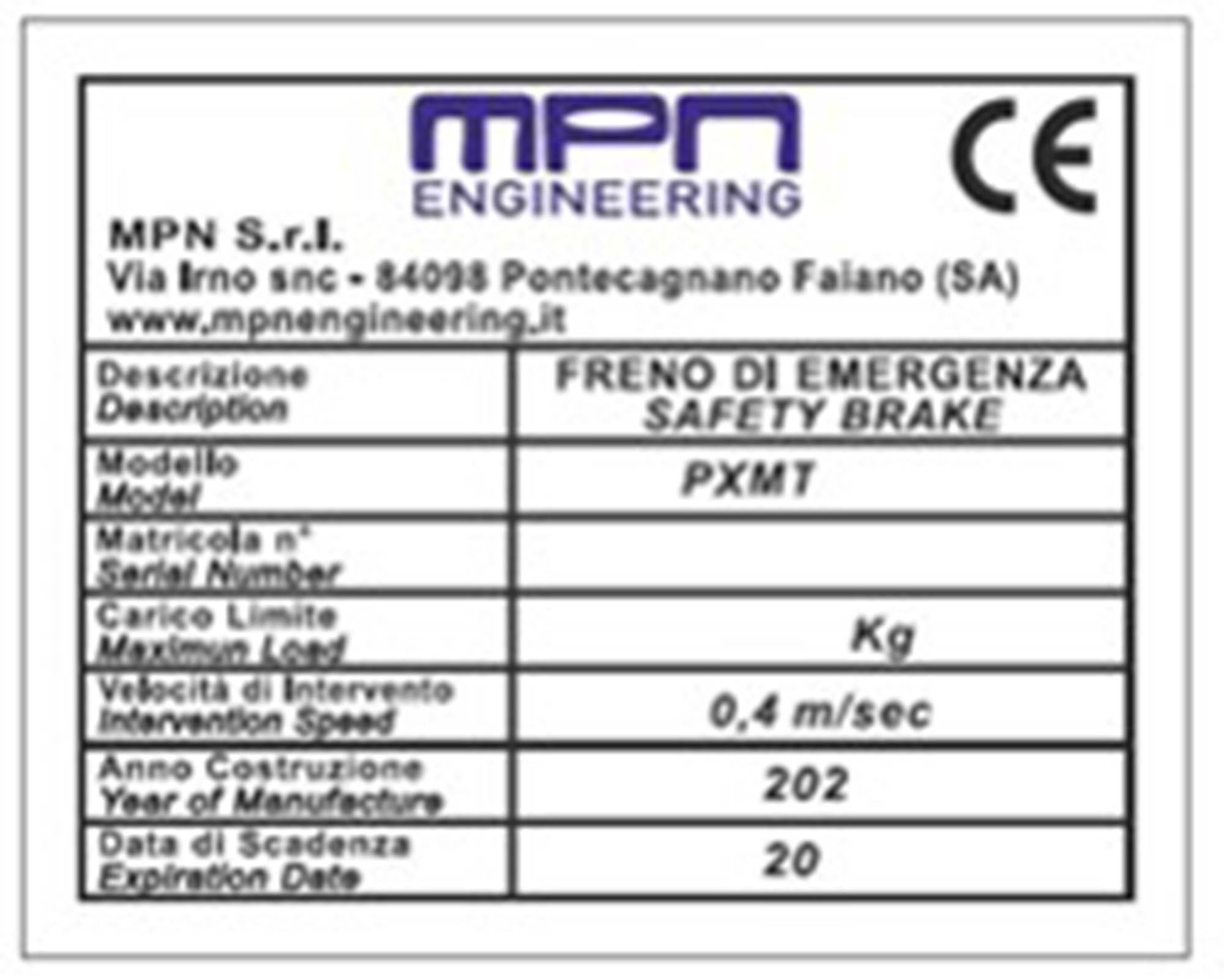La gamma di questi prodotti si articola su 4 dispositivi in base alla portata. Il carico massimo espresso nel nome è inteso azionando il dispositivo con un pignone del diametro primitivo 115mm nel caso di PXMT700 e PXMT2000 e 152mm per il PXMT3500 e PXMT4000. Nel caso in cui vari il pignone di azionamento del dispositivo, contattarci per avere il paracadute perfetto per le vostre esigenze.